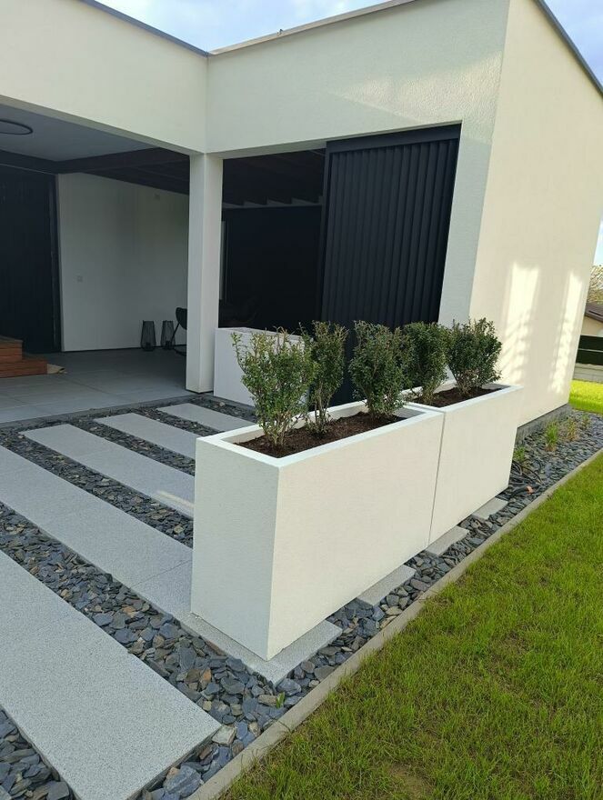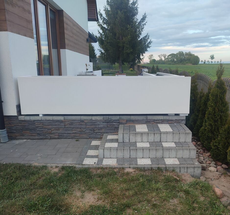 Donica termo zbudowana z twardego styropianu.Wykończona tynkiem strukturalnym baranek 1 mm